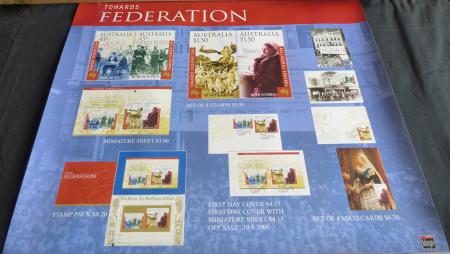 | Australia Post Poster 2000 (24 May) "Towards Federation - A Souvenir Of The Birth Of Our Nation" displaying Maxi Cards Set, First Day Cover, Miniature Sheet, Stamp Pack and Stamps 45c Taking The Vote and Waiting For The Results and $1.50 The Fair New Nation and Queen Victoria. (approx. 520mm wide x 440mm deep)