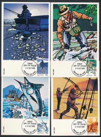 | 1979 Fishing Series x 4 Maximum Cards produced by The Stamp Promotion Councils. Featuring Trout Fishing (20c), Pleasure (35c), Deep Sea (50c) andSurf Fishing (55c). ASPC032-035. Issued 24-Oct-1979.