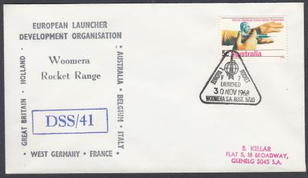 | Australia 1968 (30 Nov) Space Cover AAMC R112 ELDO F-7 Woomera SA "European Launcher/ Development Organisation/ Woomera/ Rocket Range/ Great Britain/ Holland/ Australia/ Belgium/ Italy/ West Germany/ France" and "DSS/41" addressed and affixed with 5c tan and blue Medical stamp cancelled "EUROPA 1/ROCKET/ F 7/ LAUNCHED/ 30 NOV 1968/WOOMERA S.A. AUST. 5720"