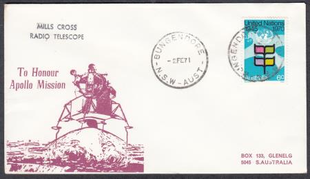 | Australia 1971 (2 Feb) Space Cover "MILLS CROSS/ RADIO TELESCOPE" and "TO HONOUR/ APOLLO MISSION/ IMAGE LANDING MODULE" addressed to Glenelg SA and affixed with 6c blue United Nations stamp cancelled "BUNGENDORE/-2FE71/N.S.W.-AUST"