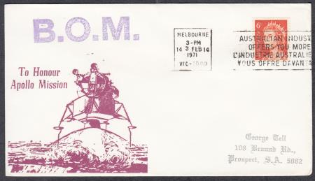 | Australia 1971 (3 Feb) Space Cover "B.O.M. (Possibly Bureau of Meteorology)" addressed to Prospect S.A. and "TO HONOUR/ APOLLO MISSION/ IMAGE MOON LANDING MODULE" and affixed with 6c orange QEII Stamp cancelled "MELBOURNE/ 3-PM/ 14 3 FEB 14/ 1971/ VIC-3000" and slogan "AUSTRALIAN INDUSTRY/ OFFERS YOU MORE/ L`INDUSTRIE AUSTRALIEN/ VOUS OFFRE D`AVANTAGE"
