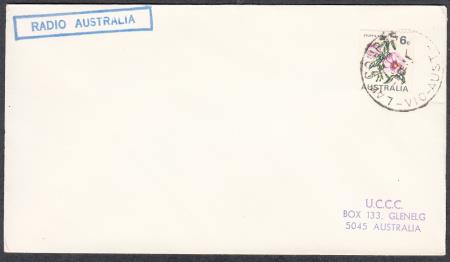 | Australia 1971 (2 Feb) "RADIO AUSTRALIA" Cover addressed to Glenelg SA without Space Cachet and affixed with 6c mauve and green Sturt`s Desert Rose stamp cancelled "LAW COURTS/-8FE71/VIC-AUST"