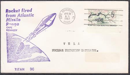 | USA 1967 (28 Apr) Space Cover `ROCKET FIRED/FROM ATLANTIC/ MISSILE/RANGE/CAPE/ KENNEDY/IMAGE OF ROCKET SEPARATION/TITAN 3C" and "VELA/NUCLEAR DETECTION SATELLITE" unaddressed and affixed with 5c Plant For A More Beautiful America stamp cancelled "CAPE CANAVERAL FL/APR 28/AM/1967/32920"