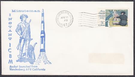 | USA 1967 (28 Apr) Space Cover blue cachet "MINUTEMAN/IMAGE SOLDIER AND ROCKET/ INSTANT ICBM/ ROCKET LAUNCHED FROM/ VANDENBERG A F B CALIFORNIA" unaddressed and affixed with 5c Mary Cassatt stamp cancelled "VANDENBERG AFB CA 93437/APR 28/AM/1967"