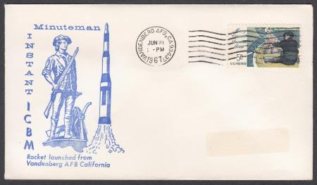 | USA 1967 (21 Jun) Space Cover "MINUTEMAN/IMAGE SOLDIER AND ROCKET/ INSTANT ICBM/ ROCKET LAUNCHED FROM/ VANDENBERG A F B CALIFORNIA" unaddressed and affixed with 5c Mary Cassatt stamp cancelled "VANDENBERG AFB CA 93437/JUN21/PM/1967"