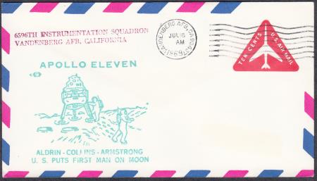 | USA 1969 (16/17 Jul) Set of seven space covers of which six with same design cachet "APOLLO ELEVEN/COMMAND CAPSULE/LANDING MODULE/TWO ASTRONAUTS DISEMBARKING AND WALKING/ MOON SURFACE" and "ALDRIN-COLLINS-ARMSTRONG/ U.S. PUTS FIRST MAN ON MOON" in green and 6596TH INSTRUMENTATION SQUADRON/VANDENBERG AFB, CALIFORNIA with embossed 10c Air Mail stamp cancelled "VANDENBERG AFD CA 93437/JUL 16/AM/1968" and, with brown cachet and "HQ NORTH AMERICAN AIR DEFENSE COMMAND/ENT AIR FORCE BASE/COLARADO" and 10c Air Mail embossed stamp cancelled "COLORADO SPRINGS/JUL 16/1969/AM/COLO" and similar covers from COMSAT, COMMUNICATIONS SATELLITE CORPORATING ANDOVER, MAINE and "SMITHSONIAN ASTROPHYSICAL OBSERVING STATION, SPAIN (JUL 17 US NAVY/17049 BR) and "73RD AEROSP SERVL WG (730DC)/?ly AFB FL (PANAMA CITY) and "966 AEW&Con Sq/MCCOY AFB FL" and NASA/ROSMAN STADAN STATION NORTH CAROLINA"