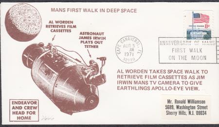 | USA 1971 (5 Aug) Space Cover "MAN`S FIRST WALK IN DEEP SPACE" and IMAGE OF MOON, SPACECRAFT, ASTRONAUTS AL WORDEN AND JAMES IRWIN/ AL WORDEN RETRIEVES FILM CASSETTE/ASTRONAUT JAMES IRWIN PLAYS OUT TETHER/ ENDEAOUR AND CREW HEAD FOR HOME" and AL WORDEN TAKES SPACE WALK TO/RETRIEVE FILM CASSETTES AS JIM/IRWIN MANS TV CAMERA TOO GIVE/ EARTHLINGS APOLLO-EYE VIEW" addressed to Sherry JHills NJ and affixed with 8c USA Flag stamp cancelled "CAPE CANAVERAL FL/AUG 5/AM/1971/32920" and slogan "ANNIVERSARY OF MAN`S/FIRST WALK/ON THE MOON"