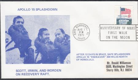 | USA 1971 (7 Aug) Space Cover "APOLLO 15 SPLASHDOWN/IMAGE THREE ASTRONAUTS/ SCOTT, IRWIN AND WORDEN/ON RECOVERY RAFT" and "AFTER 12 DAYS IS SPACE, SAFE SPLASHDOWN/APOLLO 15 `ENDEAVOUR` 300 MILES NORTH OF HONOLULU" addressed to Sherry Hills NJ and affixed with 8c USA Flag stamp cancelled "CAPE CANAVERAL FL/AUG 7/PM/1971/32920" and slogan "ANNIVERSARY OF MAN`S/FIRST WALK/ON THE MOON"