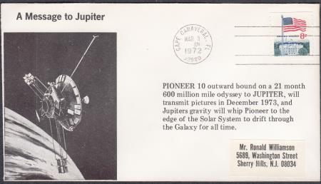 | USA 1972 (3 Mar) Space Cover "A MESSAGE TO JUPITER/IMAGE OF SATELLITE IN SPACE/ PIONEER 10 OUTWARD BOUND ON A 21 MONTH/600 MILLION MILE ODYSSEY TO JUPITER, WILL/TRANSMIT PICTURES IN DECEMBER 1973, AND/ JUPITER`S GRAVITY WILL WHIP PIONEER TO THE/EDGE OF THE SOLAR SYSTEM TO DRIFT THROUGH/ THE GALAXY FOR ALL TIME" addressed to Sherry Hills NJ and affixed with 8c USA Flag stamp cancelled "CAPE CANAVERAL FL/MAR 3/AM/1972/32920"