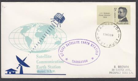 | Australia 1969 (19 Nov) Space Cover "IMAGE GLOBE/RADIO TELESCOPE/SPACE CRAFT" and "SATELLITE/COMMUNICATION/EARTH STATION/BLUE BAR (DELETING MOREE NSW)" and addressed to Prospect S.A. with 5c J C Watson Stamp and Tab cancelled "CARNARVON/19NO69/WEST-AUST" and purple oval handstamp "OTC (A) SATELLITE EARTH STATION/CARNARVON"