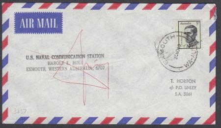 | Australia 1969 (20 Nov) Set of 4 Signed Air Mail Space Covers black stamped "U.S. NAVAL COMMUNICATION STATION/HAROLD E. HOLT/EXMOUTH, WESTERN AUSTRALIA, 6707" and signed in red pen and addressed to Elizabeth East (3) or Unley South Australia and affixed with either 5c Caroline Chisholm or A B Banjo Paterson or Albert Namatjira (2) stamps cancelled "EXMOUTH/20NO69/WA-AUST"