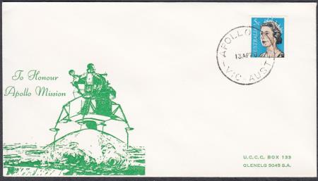 | Australia 1970 (18 Apr) Set of two Space Covers in blue or green "TO HONOUR/APOLLO MISSION/IMAGE OF SPACECRAFT" and addressed to Glenelg S.A/ and affixed with 5c QEII Coil Stamp cancelled "APOLLO BAY/18AP70/VIC-AUST"