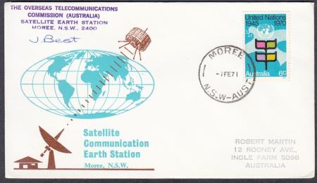 | Australia 1971 (01 Feb) Set of Five Signed Space Covers with silver and green cachet "IMAGE GLOBE/RADIO TELESCOPE/SPACE CRAFT" and "SATELLITE/COMMUNICATION/EARTH STATION/MOREE N.S.W." and purple handstamp "THE OVERSEAS TELECOMMUNICATIONS/COMMISSION (AUSTRALIA)/SATELLITE EARTH STATION/MOREE N.S.W. 2400" and signed underneath by "J. BEST" and addressed to either Kurralta Park or Ingle Farm or Plympton (2) or Unley S.A. with either 6c QEII stamp or 6c United Nations 25th Anniversary stamp of 6c QANTAS 50th Anniversary stamp or 6c 1970 Christmas stamp or 6c Cocos (Keeling) Islands Flying Fish stamp and cancelled "MOREE/-1FE71/N.S.W.-AUST".(Launch date of APOLLO 14 was 21:03:02 UTC 31st January (07:03:02 AEST 1st February 1971)
