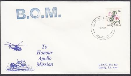 | Australia 1971 (08 Aug) Space Cover stamped in blue "B.O.M." (Bureau Of Meteorology) and blue cachet "IMAGE HELICOPTER/SPACE CAPSULE ON SEA/TO/HONOUR/APOLLO/MISSION" and addressed to Glenelg S.A. with 6c Sturt`s Desert Rose stamp cancelled "G.P.O. PERTH/-8AU71/WA-AUST". The usual concern of space weather is the varying electromagnetic energy and atomic particle flux throughout the interplanetary medium mainly from the Sun to the Earth. APOLLO 15 Landed 7th August 1971 Pacific Ocean (8th August 1971 Australian time)