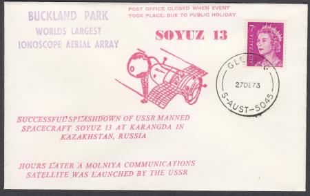 | Australia 1973 (27 Dec) Space Cover with red cachet "SOYUZ 13/IMAGE OF SPACECRAFT IN FLIGHT/SUCCESSFUL SPLASHDOWN OF USSR MANNED/SPACECRAFT SOYUZ 13 AT KARANGDA IN/KAZAKHSTAN, RUSSIA" and "HOURS LATER A MOLNIYA COMMUNICATIONS/SATELLITE WAS LAUNCHED BY THE USSR" and purple handstamp "BUCKLAND PARK/WORLDS LARGEST/IONOSCOPE AERIAL ARRAY" and in red POST OFFICE CLOSED WHEN EVENT/TOOK PLACE DUE TO PUBLIC HOLIDAY" (Landing date 26 December 1973, 08:50:35 UTC) unaddressed and affixed with 7c purple QEII stamp cancelled "GLENELG/27DE73/S-AUST-5045".