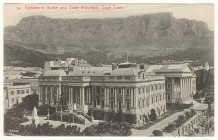 Postcard showing a view of Parliament House and Table Mountain, Cape Town, unused.