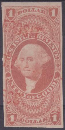| 1862-71 $1 Red, imperf, Entry of Goods Revenue, Sc R67a, used |